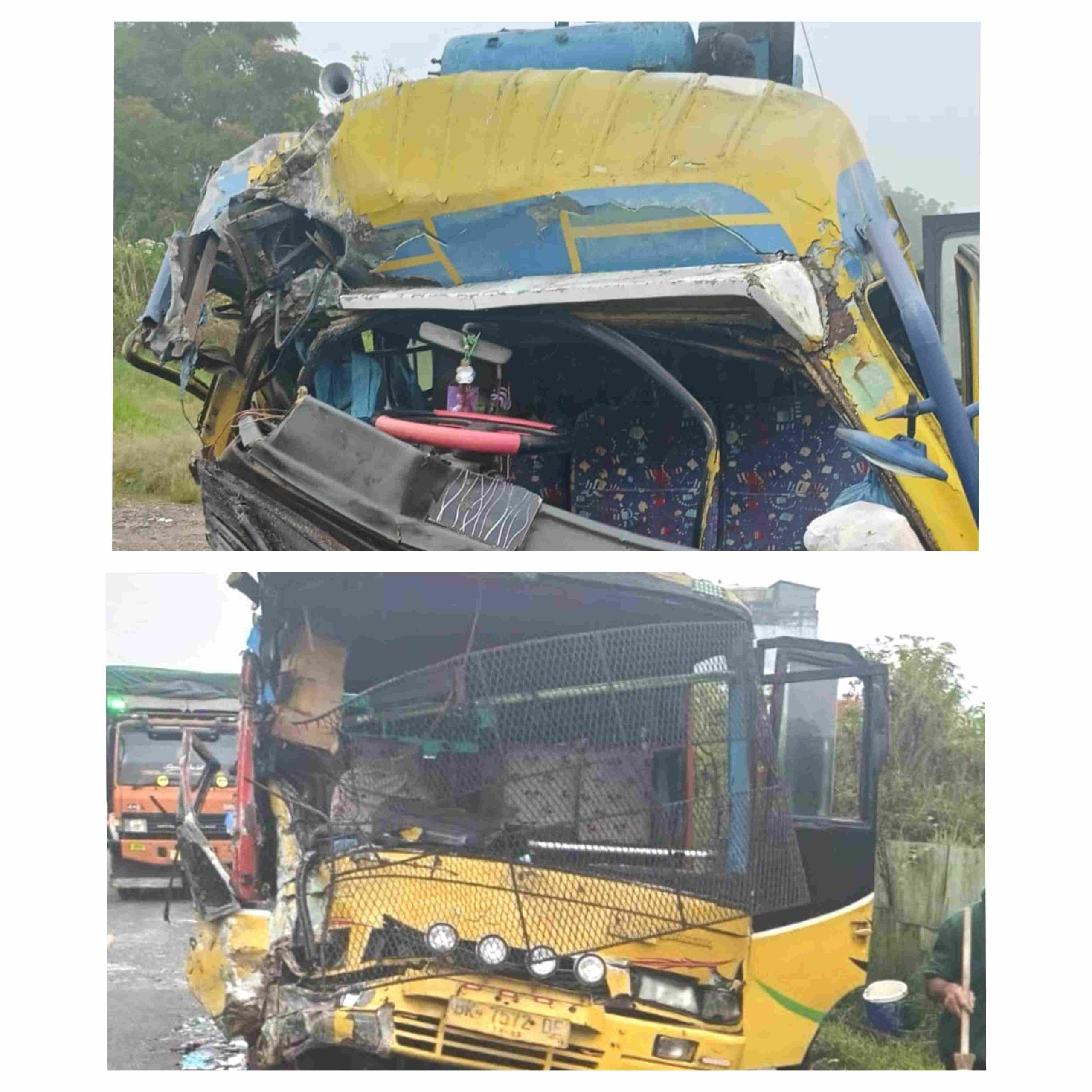 Bus Opranto BB 7691 EA bertabrakan dengan bus Pariwisata BK 7572 DE di Jalan lintas sumatera (Jalinsum) Siborongborong, Kabupaten Tapanuli Utara (Taput), Jumat (29/12/2023).