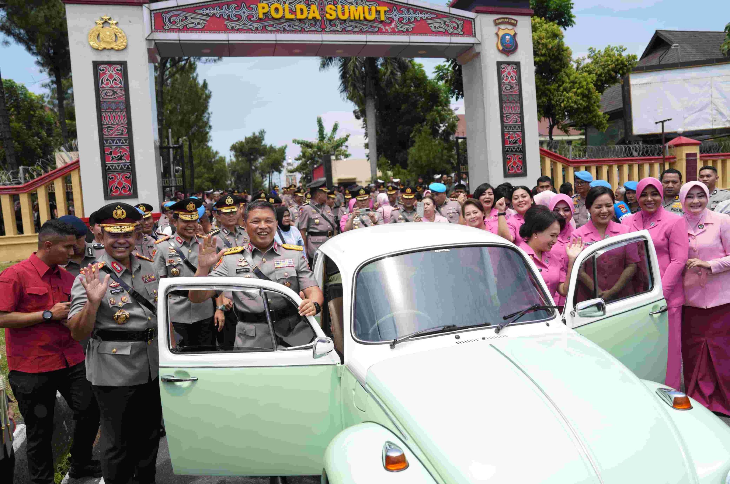 Dengan mengendarai mobil kodok, mantan Kapolda Sumut tersebut dilepas penggantinya, Irjen Pol Whisnu Hermawan Februanto dan Waka Polda Sumut, Brigjen Pol Rony Samtana serta para PJU hingga Kapolres jajaran ke gerbang III pintu keluar Mapoldasu.