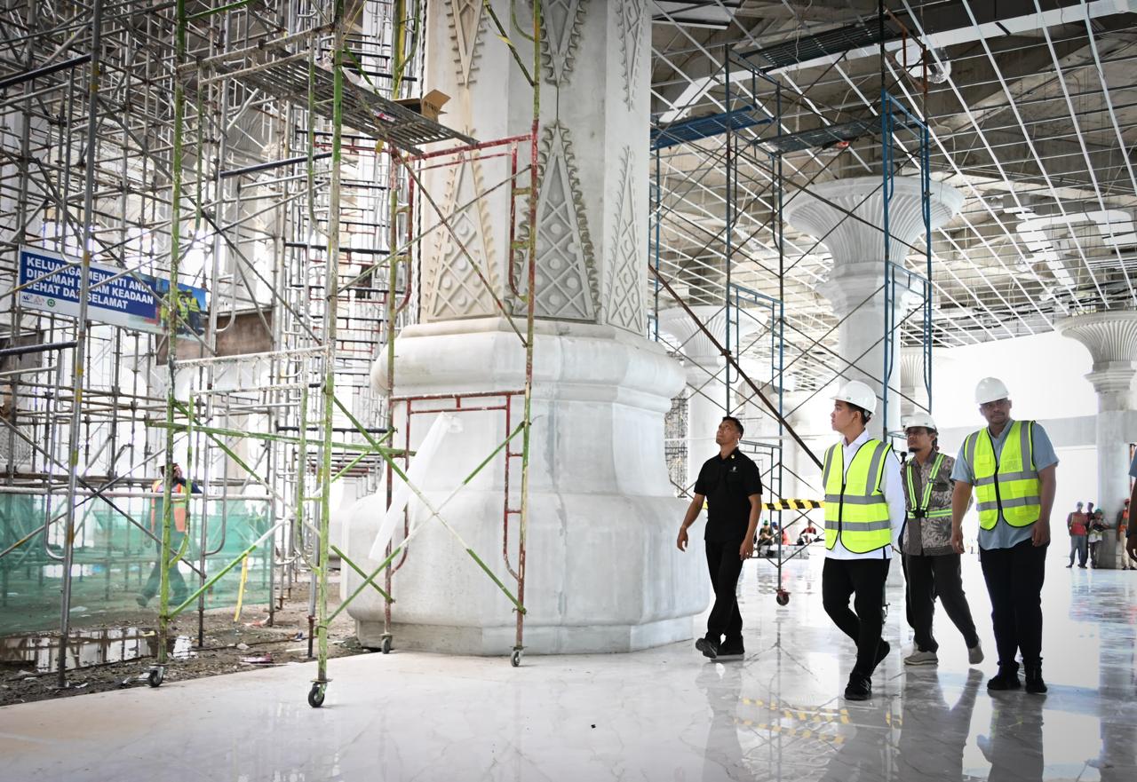 Setelah mendengar penjelasan tersebut, Wapres bersama rombongan pun memasuki bangunan masjid besar dan megah yang hampir rampung itu. Gibran memperhatikan dengan saksama hasil sementara pekerjaan tersebut.