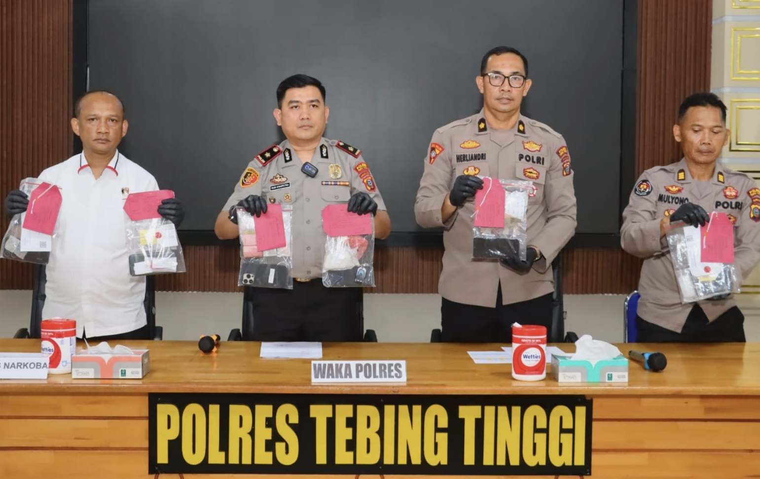 Tunjukkan: Waka Polres Tebingtinggi, Kompol Rudi Syahputra didampingi Kabag Ops Kompol Herliandri, Kasat Resnarkoba AKP Jimmy Rianto Sitorus dan Kasi Humas AKP Mulyono menunjukkan sejumlah barang bukti tindak pidana narkotika periode Januari-April 2026, pada konferensi pers, Rabu (29/4/2026).(Foto:Dok/Ar)